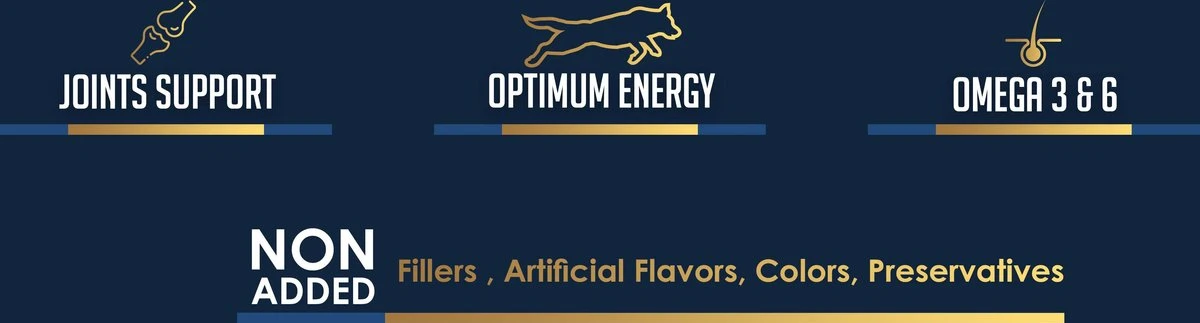 | Voedingswaarde | 28% Gedroogde kip, mais, bruine rijst, gerst, gevogeltevet, gedroogde bietenpulp, gedroogde vis, lijnzaad, eipoeder, zalmolie, biergist, gedroogde johannesbroodpeulen, glucosamine, chondroitine, vitamines en mineralen.<br /><br />Eiwitbron: 83% Dierlijke eiwitten en 17% plantaardige eiwitten. |