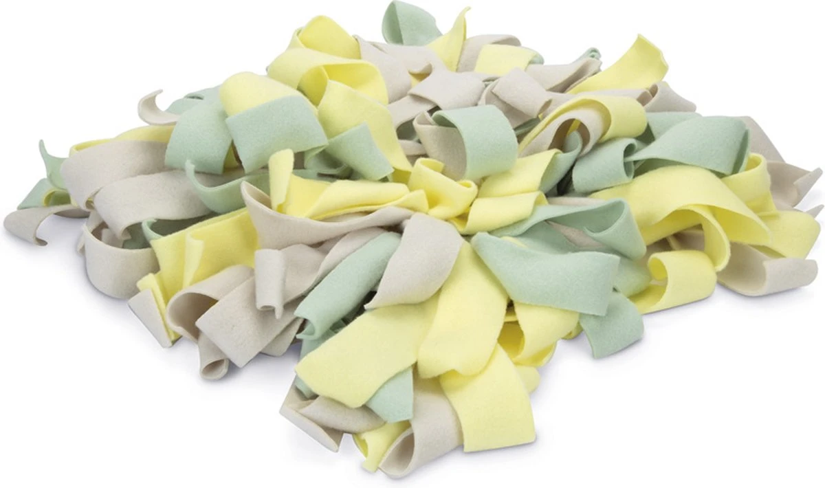 De Beeztees Puppy Sniffy Snuffelmat geeft jouw pup heel veel uitdaging. Deze snuffelmat kun je gebruiken om koekjes of andere lekkernijen in te verstoppen. Door de vele slierten, zal jouw pup veel moeite moeten doen om de snacks te vinden. Deze mat bestaat uit allemaal verschillende gekleurde stroken, kort en lang. Doordat de mat is gemaakt van joggingstof, voelt het lekker zacht aan voor de neus. Met een snuffelmat kun je samen met jouw pup spelen, wat ook nog eens de band tussen jullie versterkt. Let op: zorg ervoor dat jouw pup niet op de mat gaat bijten of kauwen. – Gemaakt van joggingstof – Mentale stimulatie – Verkrijgbaar in twee maten Afmetingen: – 22x22x4 cm – 30x30x4 cm