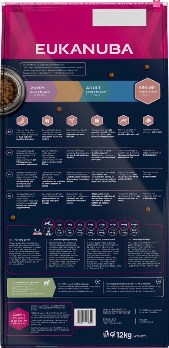 Eukanuba’s beste Mature & Senior hondenvoeding voor elk ras met gevoelige huid en maag, rijk aan lamsvlees. Eukanuba Mature & Senior droge hondenvoeding voor elk ras rijk aan lamsvlees en rijst bevat prebiotica en bietenpulp, waarvan klinisch is bewezen dat ze de spijsvertering en de optimale opname van voedingsstoffen bevorderen. Dit hondenvoer bevat antioxidanten waarvan klinisch bewezen is dat ze een sterke natuurlijke weerstand van uw hond bevorderen, en omega-6- en omega-3-vetzuren voor een gezonde huid en een glanzende vacht. Hoogwaardige dierlijke eiwitten (kip is het belangrijkste ingrediënt) helpen de spieren sterk en soepel te houden (klinisch bewezen) en calcium is goed voor sterke botten. Deze hondenvoeding bevat prebiotica en bietenpulp, waarvan klinisch is bewezen dat ze de spijsvertering en een optimale opname van voedingsstoffen bevorderen. De voeding is ontwikkeld in samenwerking met dierenartsen en wordt aanbevolen door topfokkers om uw hond een 100% volledig en uitgebalanceerd dieet te geven. Ieder dieet van Eukanuba Mature & Senior droge hondenvoeding bevat de 3D DentaDefense-technologie en reinigt daardoor met iedere hap, vermindert de opbouw van tandsteen tot wel 80%* en helpt uw hond een gezond gebit te houden.