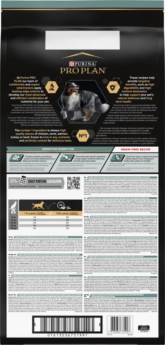 PURINA® PRO PLAN® Sensitive Digestion Grainfree hondenvoer rijk aan kalkoen bevat prebiotica waarvan wetenschappelijk is aangetoond dat deze bifidobacteriën verhogen voor een betere balans in de microbriële darmflora. Het recept is graanvrij en het nummer 1 ingrediënt is stukken kalkoen van hoge kwaliteit, ingevroren om belangrijke voedingsstoffen vast te houden en perfect gekookt voor een heerlijke smaak. PRO PLAN® Sensitive Digestion hondenbrokken zijn makkelijk verteerbaar, samengesteld met specifieke ingrediënten om de darmgezondheid te ondersteunen en een goede ontlasting te bevorderen. Bij PURINA® PRO PLAN® past ons team van voedingsdeskundigen en dierenartsen geavanceerde wetenschap toe om onze meest geavanceerde en efficiënte combinatie van voedingsstoffen voor jouw huisdier te ontwikkelen.