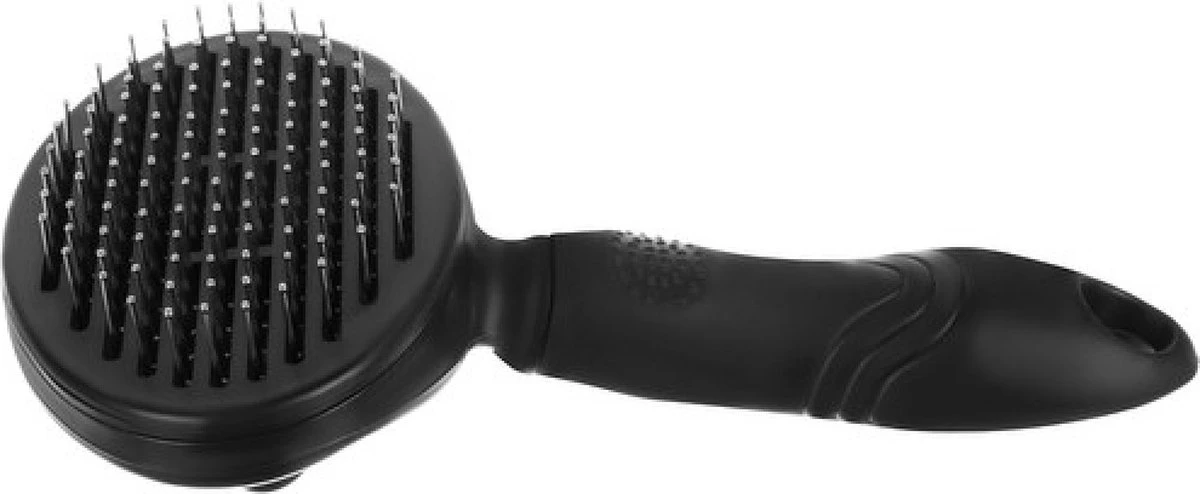 - ZELFREINIGEND – de borstel is zelfreinigend, dankzij de handige knop verwijdert hij effectief en snel haar van de naalden. Het is een erg handige oplossing bij het kammen van een dier, want u hoeft de haren niet uit te trekken tijdens het borstelen, gebruik gewoon de handige knop en de vacht komt vanzelf omhoog.