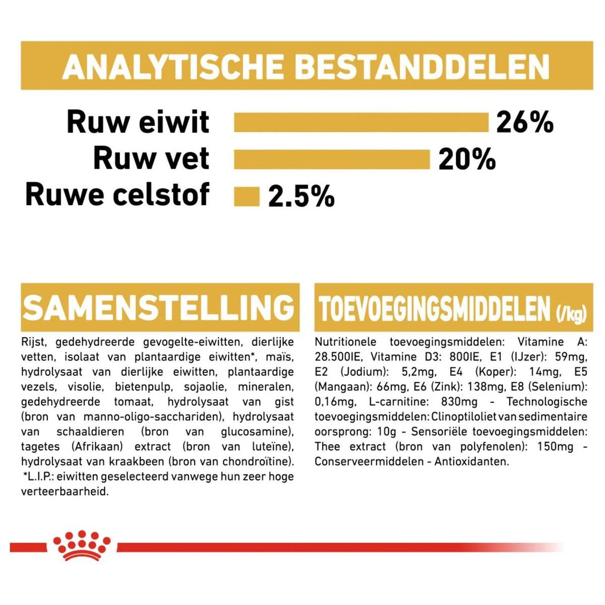 | Voedingswaarde | Rijst, isolaat van plantaardige eiwitten, gedehydreerd gevogeltevlees, dierlijke vetten, maïs, plantaardige oliën, hydrolysaat van dierlijke eiwitten, mineralen, plantaardige vezels, bietenpulp, visolie, tomaat (bron van lycopeen), natriumpolyfosfaat, kaliumcitraat, hydrolysaat van gist, taurine, L-lysine, hydrolysaat van schaaldieren, L-carnitine, extracten uit groene thee en druiven, Tagetes extract, hydrolysaat van kraakbeen |