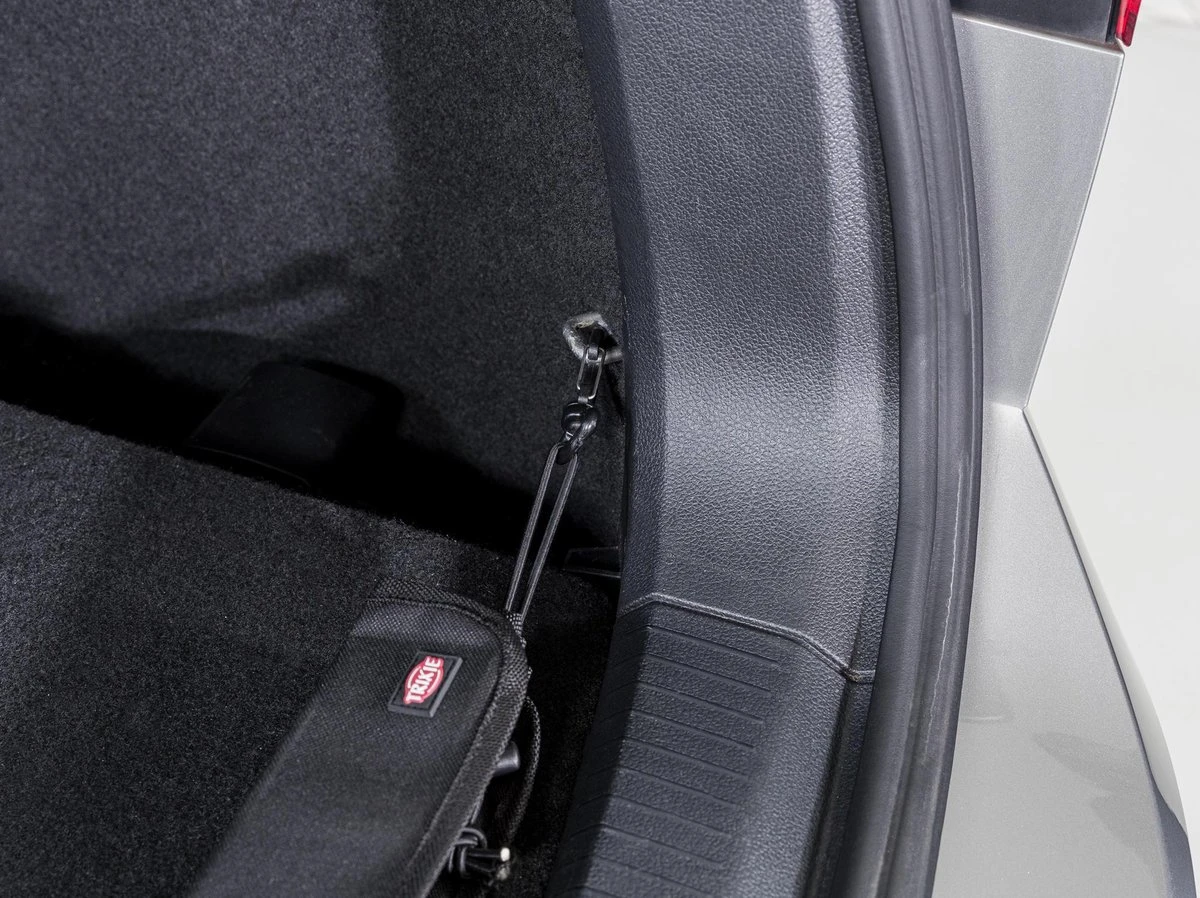 De Trixie Bumperbescherming Opvouwbaar Zwart 80 x 63 cm is een rubberen beschermingsmat met versterkingsinzetstukken ter bescherming van de autobumper. Het ideale middel om de hond in en uit de kofferbak te laten springen zonder dat de nagels schade aan de lak van de auto of de kunststof delen veroorzaken. Tevens zorgt deze bescherming voor meer grip, zodat de hond gemakkelijker in en uit de auto kan springen. De bescherming is gemaakt van rubber en voorzien van versterkte inzetstukken. Met elastieken banden en karabijnhaken kan de bumperbescherming eenvoudig aan de laadhaken in de kofferbak worden bevestigd. Wanneer deze niet gebruikt wordt, kan deze mat eenvoudig ruimtebesparend op te bergen en met klittenband vastgemaakt worden.