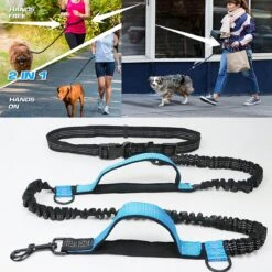 Merkloos Allernieuwste® Elastische Hondenriem 2-in-1 HANDSFREE Voor Hardlopen Shoppen En Wandelen – Honden Riem 160/260 Cm – Blauw Zwart