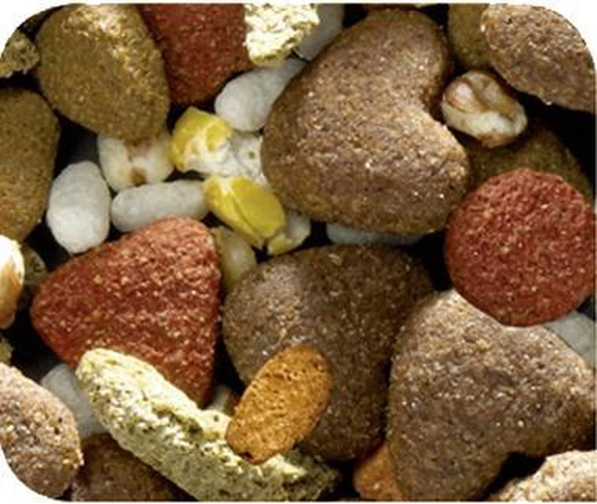 | Voedingswaarde | Samenstelling: Vlees en dierlijke bijproducten (12% kip in de bruine, rode en gele brokjes) / Granen (4% maïs in de bruine brokjes) / Plantaardige bijproducten / Groenten (5% erwten in de gele en bruine brokjes, 0,5% wortel in de oranje en bruine brokjes en 0,5% tomaat en 0,5% broccoli in de bruine brokjes) / Oliën en vetten / Zaden / Mineralen / Gist / Vruchten (0,5% appel in de bruine brokjes) |